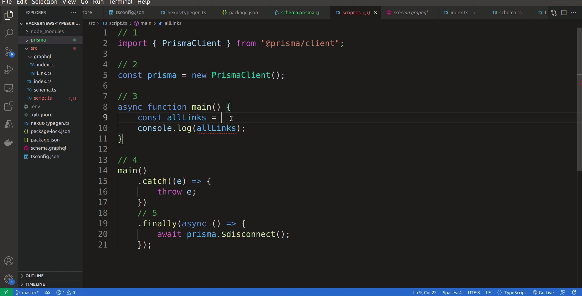 // 1: Import the PrismaClient constructor from the @prisma/client node module.// 2: Instantiate PrismaClient.// 3: Define an async function called main to send queries to the database. You will write all your queries inside this function. You are calling the findMany() query, which will return all the link records that exist in the database.// 4: Call the main function.// 5: Close the database connections when the script terminates.Take a moment to re-type the query line and notice the helpful autocompletion you get after typing prisma. and prisma.link.. The autocompletion lets us see all of the possible models we can