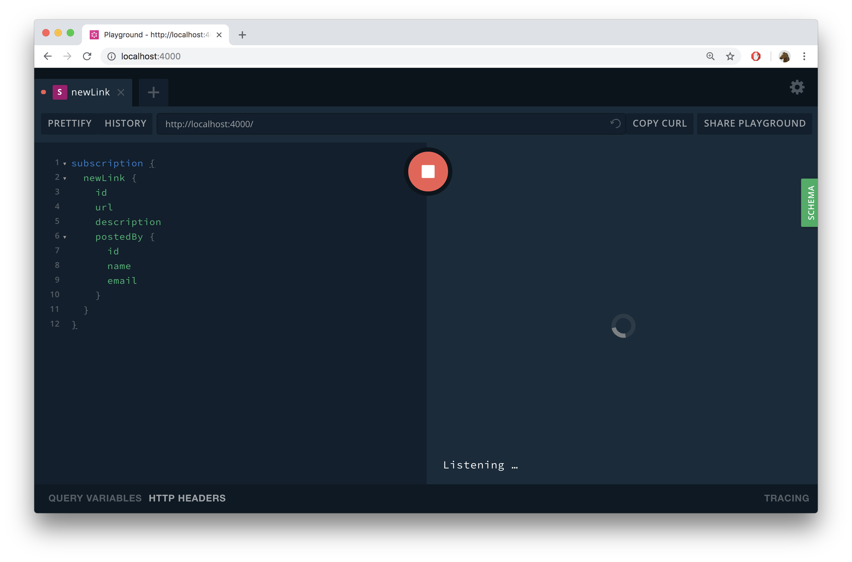 In contrast to what happens when sending queries and mutations, you’ll not immediately see the result of the operation. Instead, there’s a loading spinner indicating that it’s waiting for an event to happen.