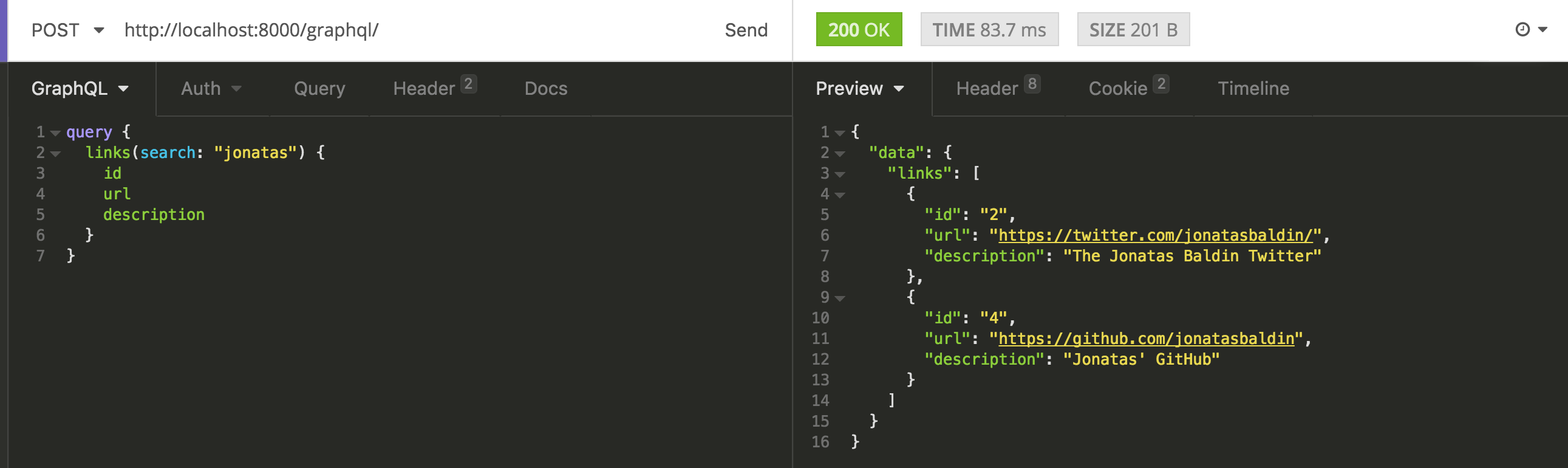 You already can list all links, but another feature of Hackernews is to search them, by URL or description. In GraphQL, this concept is the same as mutations: you pass an argument to the links field, used by the resolver to filter the results.